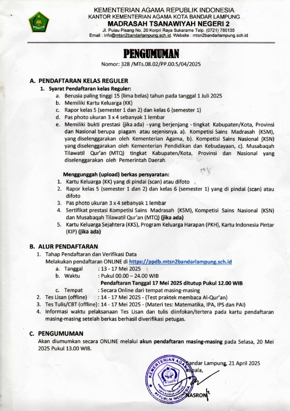 Penerimaan Peserta Didik Baru (PPDB) Kelas Reguler MTs Negeri 2 Bandar Lampung