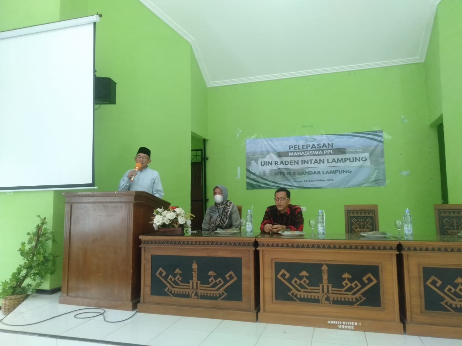 Bandar Lampung MTsN 2 (Inmas). Jum'at, tanggal 30 September 2022 MTs Negeri 2 Bandar Lampung gelar acara pelepasan mahasiswa PPL UIN Raden Intan Lampung berjumlah 20 orang di Aula MTs Negeri 2 Bandar Lampung. Kegiatan ini dihadiri oleh DPL(Dosen Pembimbing Lapangan) Dr Zulhanan.MA, Kepala TU, para Waka, guru pamong dan dewan guru serta beberapa siswa yang tampil memeriahkan kegiatan tersebut.